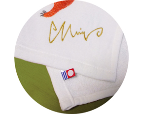 「MiW」のサインを刺繍で入れました。また、タオル裏には品質の証である「今治タオル」のマークもついています。