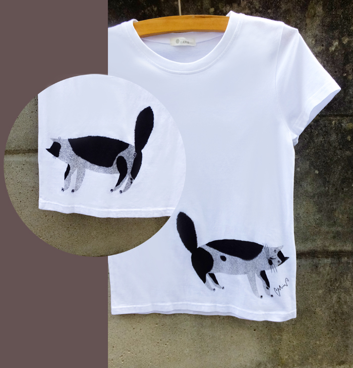 オフホワイトのシンプルなTシャツの下の方にちっぽけ無愛想な猫がテケテケと。